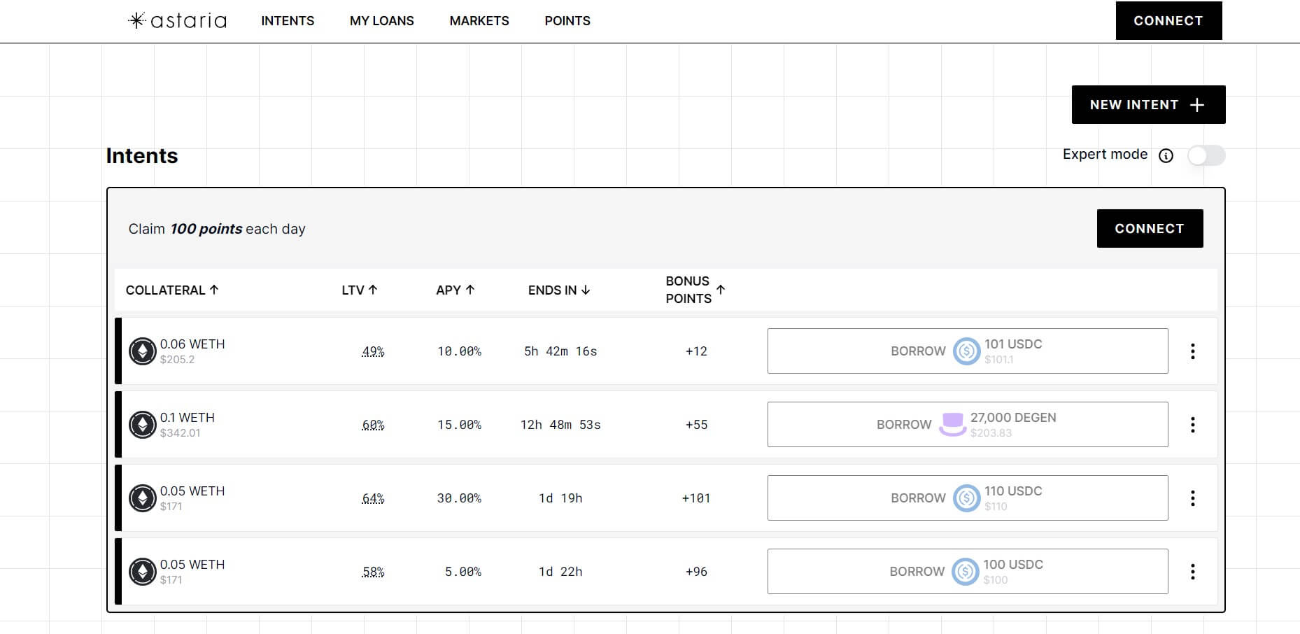 Astaria is a lending protocol that enables fixed-rate, intent-based borrowing and lending of any asset for unlimited durations without requiring an oracle. It allows users to create intents for loans they wish to take or offer, specifying terms and assets involved.