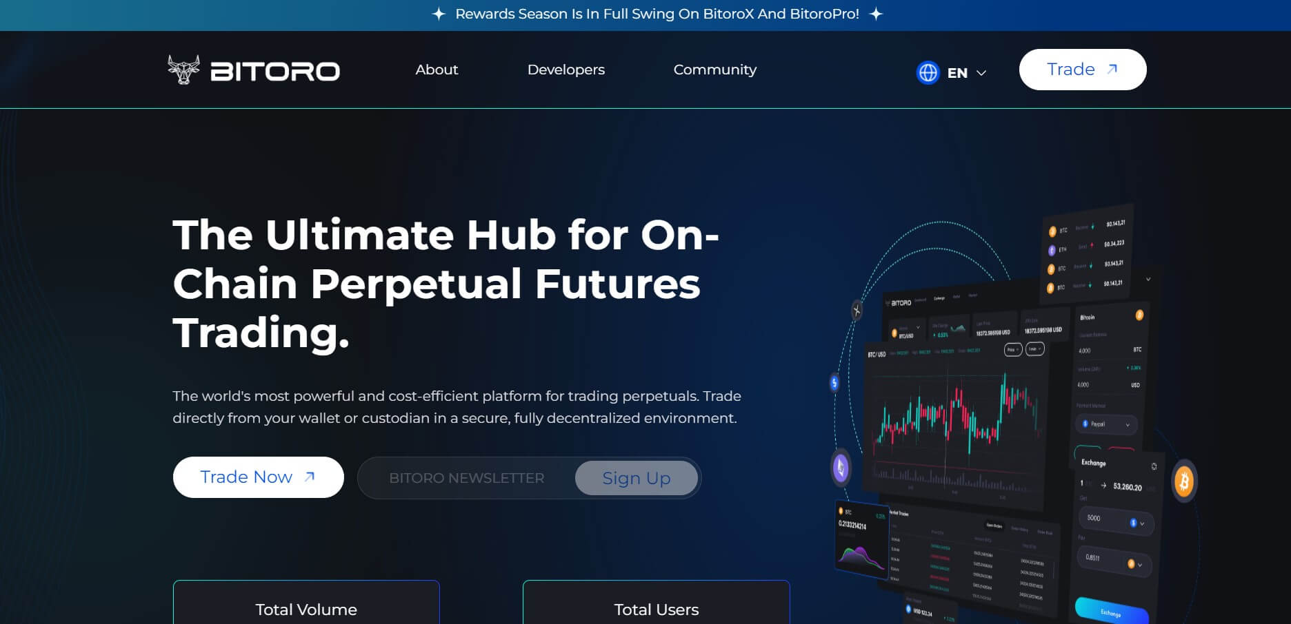 Bitoro Network is a decentralized perpetual exchange that facilitates on-chain futures trading with high leverage. It includes universal margin accounts, gasless trading, and aggregated liquidity from various sources.