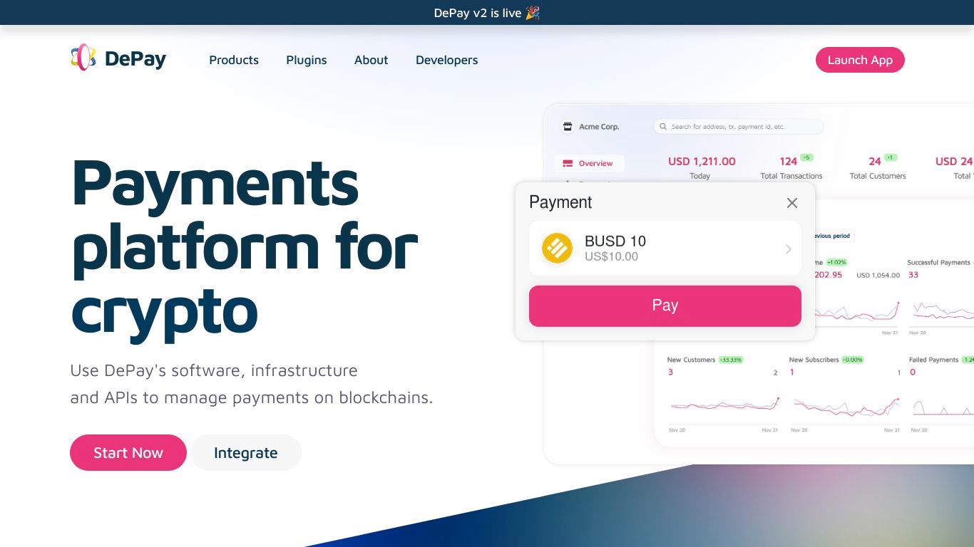 - Non-custodial paymentsSimple SDK and API integration for developersSupports payments with any tokenCompatible with popular e-commerce platformsProvides quick transaction processing times