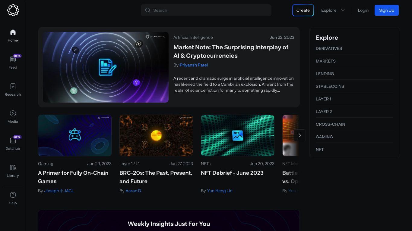 - In-depth crypto market research and analysisComprehensive reports on various crypto topicsExpertise in derivatives, lending, stablecoins, cross-chain interoperability, and NFTsDatahub, library, and help section for additional resources and supportReputable source for top-tier firms and investors