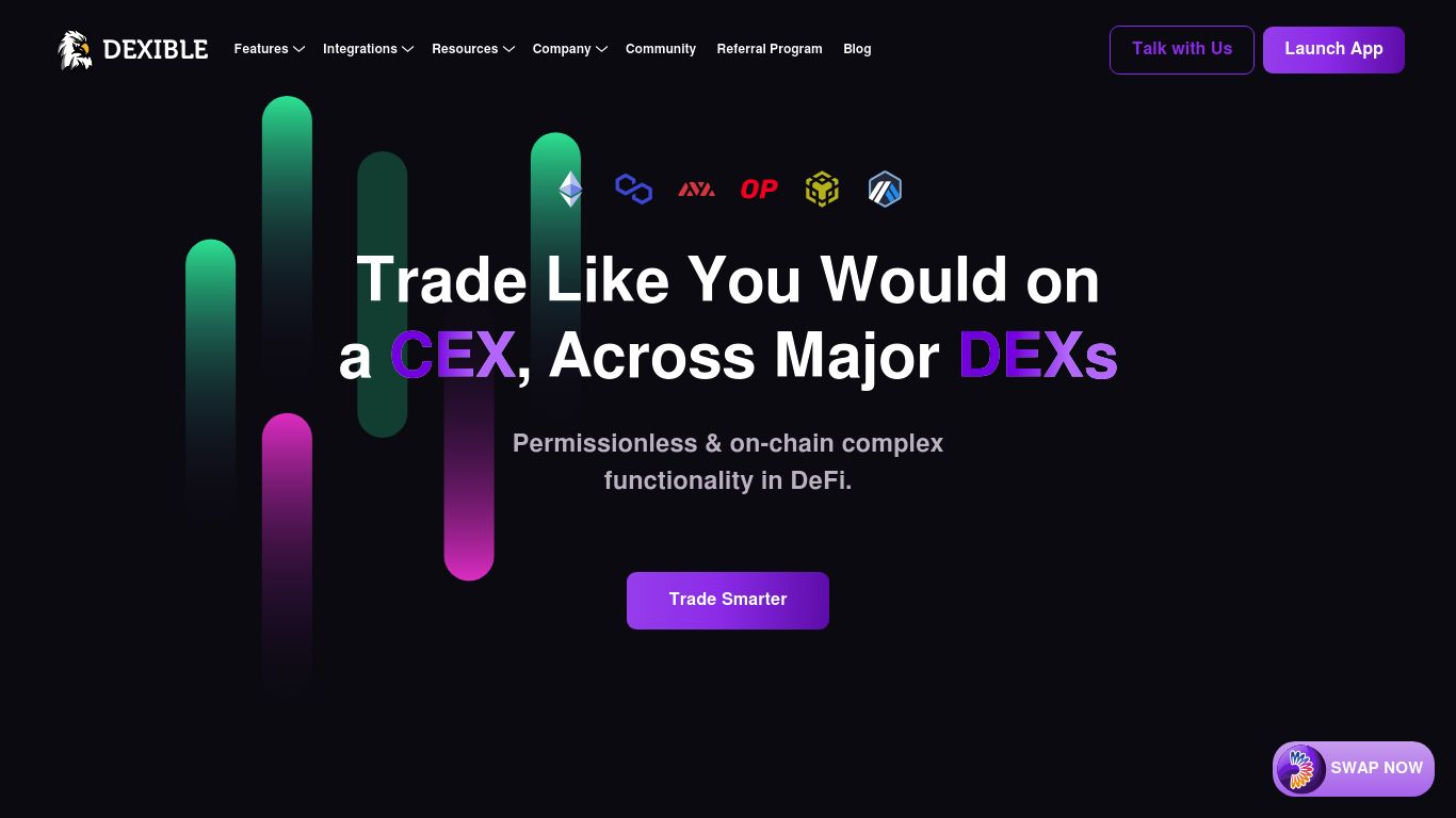 Dexible provides capital efficient DeFi trading with aggregation and execution for best pricing. Traders can set swaps on the platform.