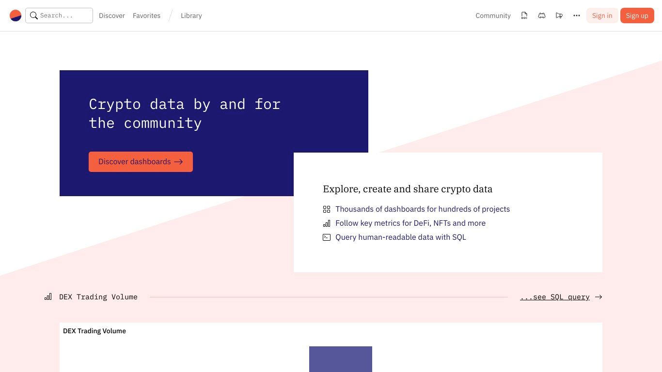 On Dune Analytics, you can find dashboards for a wide range of projects. These dashboards allow you to create custom charts and visualize data using plain SQL queries. Some of the projects for which you can find dashboards include DeFi, NFTs, DEX trading volume, stablecoins, and potential airdrops. Additionally, Dune Analytics offers thousands of community-created analytics dashboards that you can explore, fork, and customize.