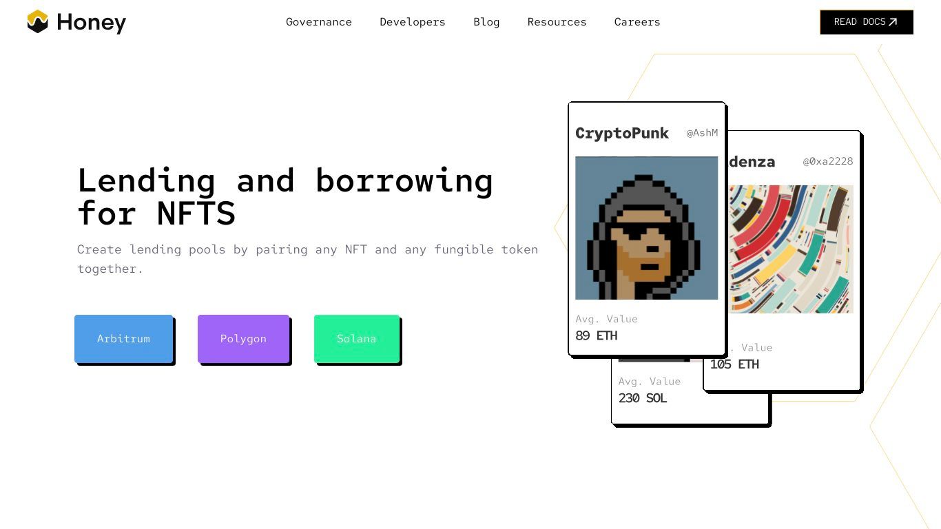 Honey Finance is a lending platform that allows NFTs to be used as collateral for peer-to-contract loans and NFT farming. The governance token $HONEY can be minted by staking NFTs. This system enables a dynamic marketplace where lenders can offer loans under flexible terms, and borrowers can leverage their NFTs without selling them.