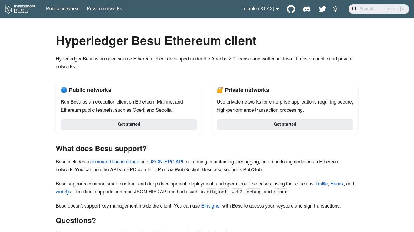 Hyperledger Besu is an Ethereum execution client that supports smart contract development, deployment, and operations. Users can run, maintain, debug, and monitor their nodes on Ethereum networks using Besu's command line interface and JSON-RPC APIs. Besu is written in Java under the Apache 2.0 license, and supports projects all around the world while running thousands of Ethereum nodes.
