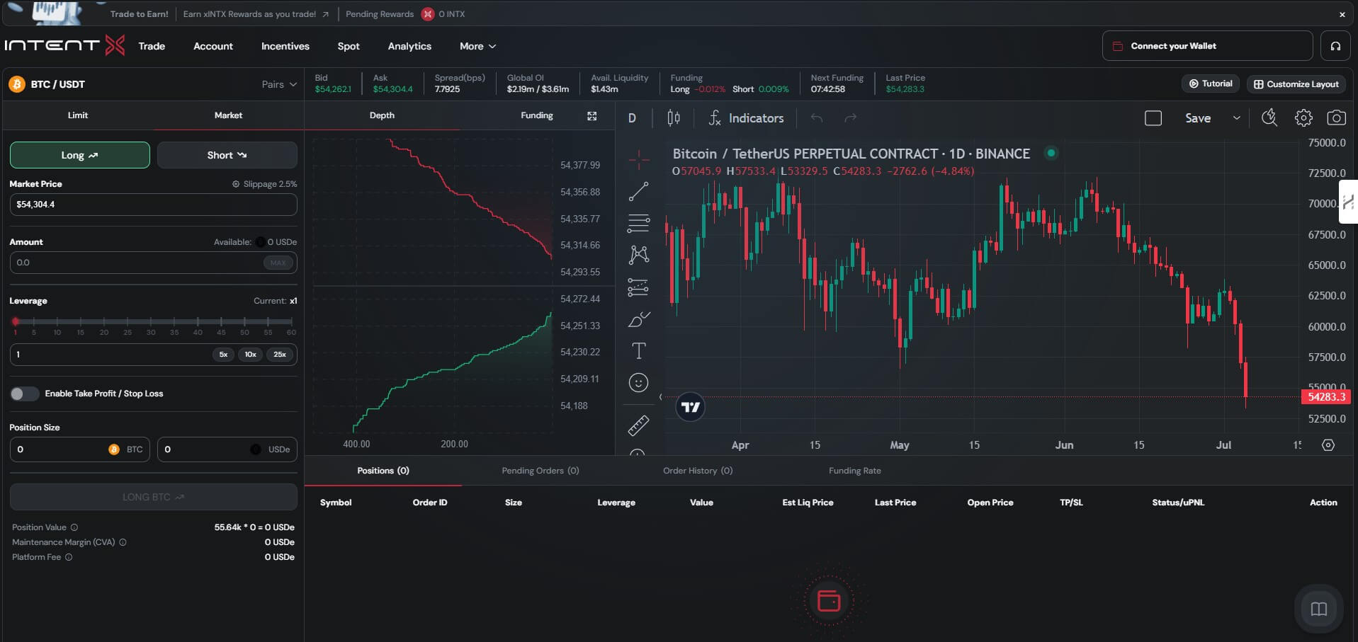 IntentX is a next-generation OTC derivatives exchange specializing in perpetual futures trading. This design aims to enhance trading by offering low fees, deep liquidity, and capital efficiency, which allows traders to leverage their assets significantly.