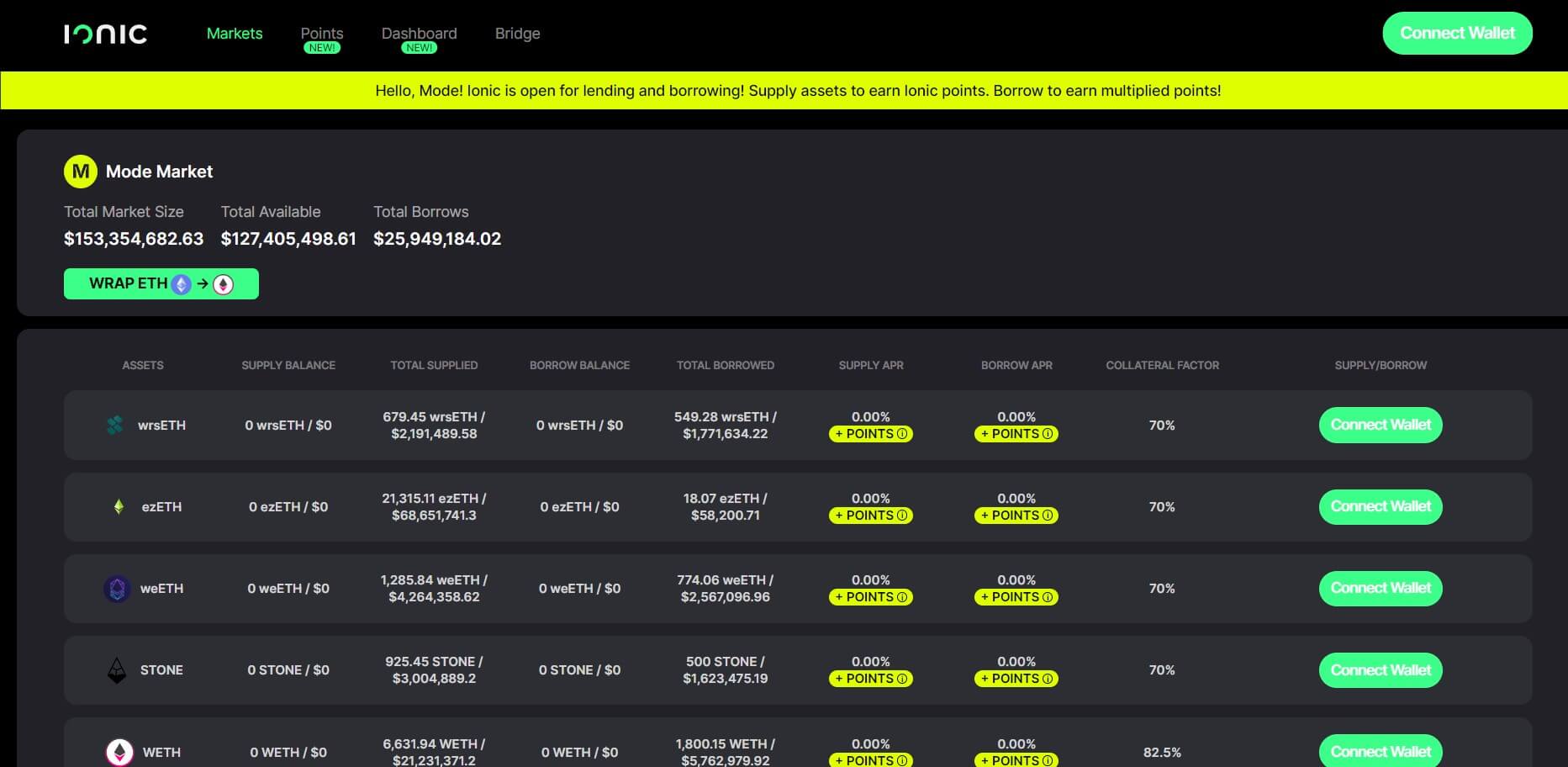 Ionic is a lending platform designed to enhance capital efficiency in the Mode ecosystem. It supports various assets and provides tools for leveraging, yield optimization, and lending and borrowing services. Ionic Money allows users to deposit their crypto holdings and potentially earn interest on them.