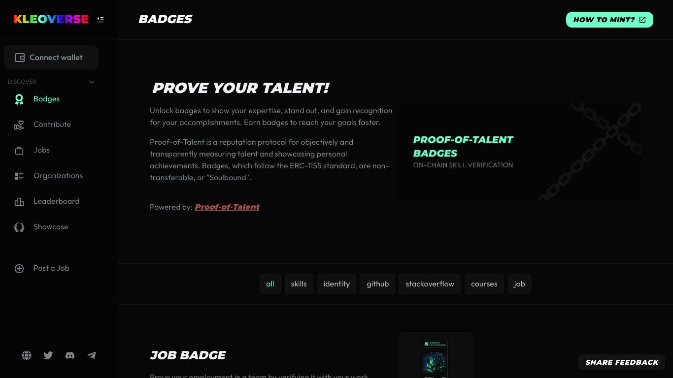 Skill Badges are a core element of the Proof-of-Talent protocol. They represent the aggregate number of skill points earned in different coding languages. To increase skill points, individuals need to mint badges from Github or Stackoverflow.