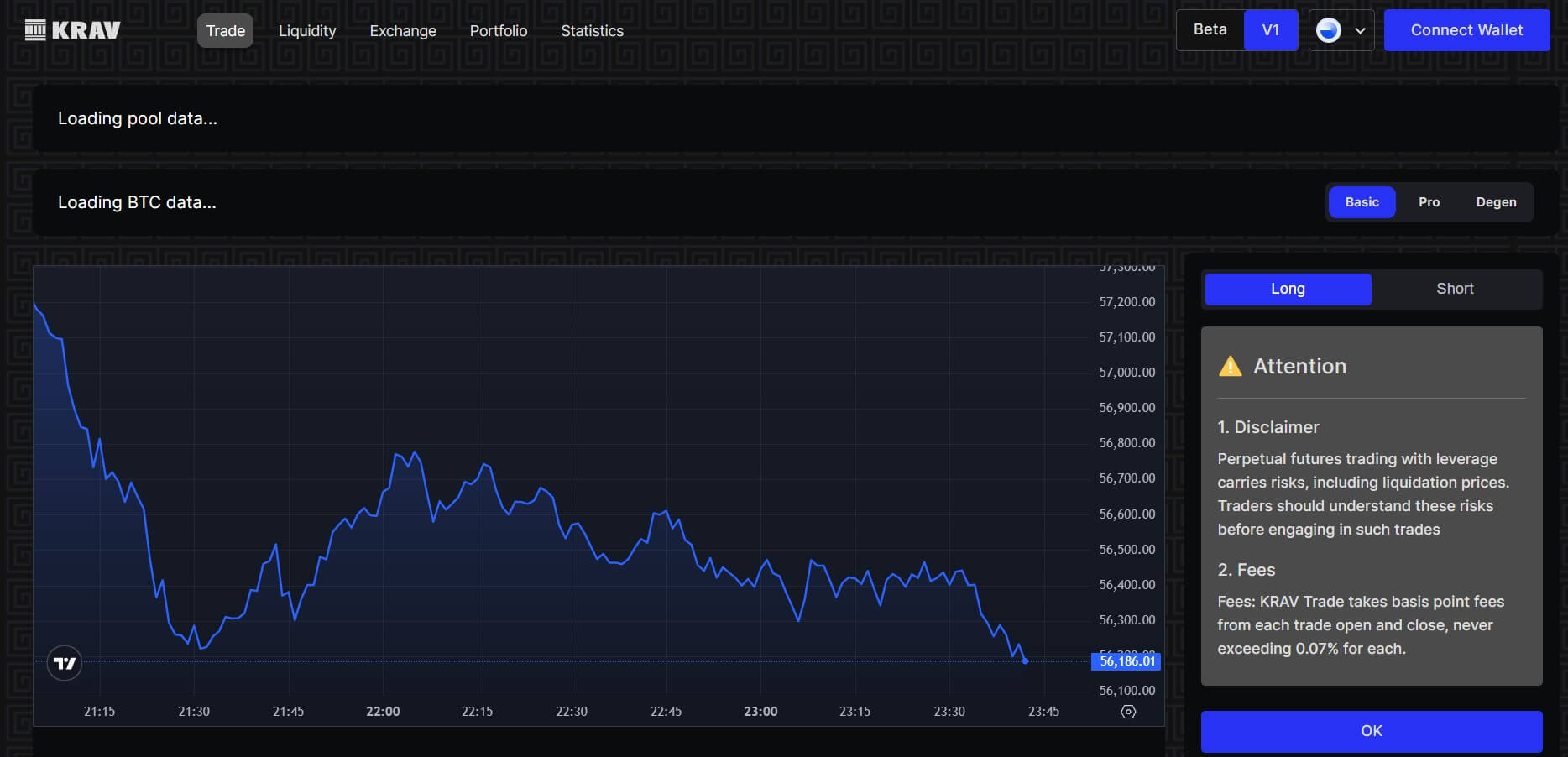 Krav Trade is a trading platform that specializes in quanto perpetual futures, allowing users to trade BTC perpetuals using any altcoin as collateral. It features mechanisms to handle profit and loss calculations based solely on BTC price movements in USD, offering up to 900% max PnL.