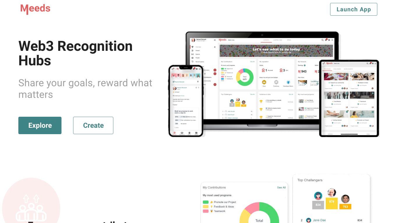 Meeds tokenizes engagement by transparently valuing daily invisible efforts and incentivizing contributors on work hubs for rewards and recognition done on-chain to build an on-chain reputation, with the aim of solving global work disengagement.