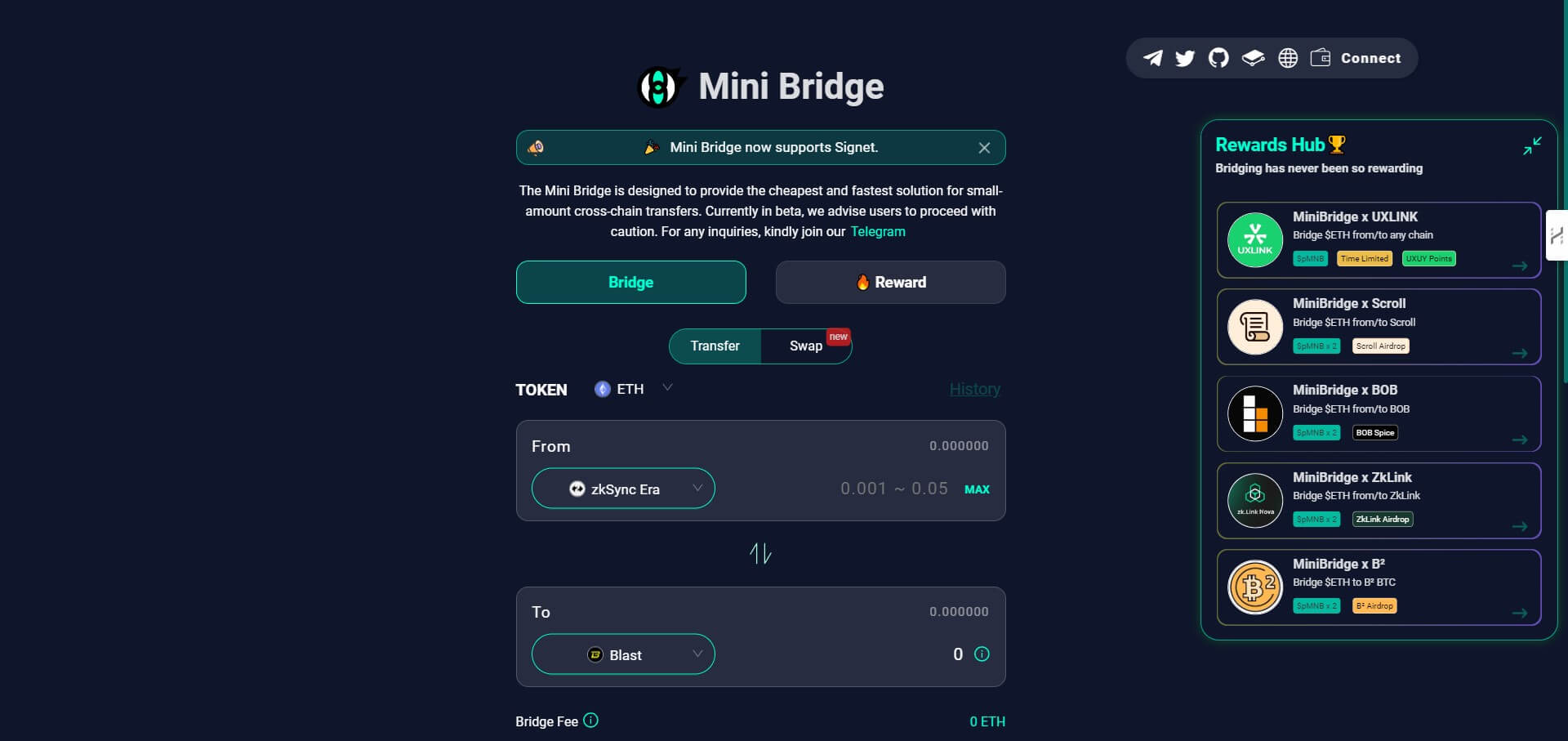 MiniBridge is a cost-effective cross-chain bridge suitable for transferring small amounts across blockchains. It focuses on minimizing fees and reducing transfer times, making it ideal for users needing to move lesser amounts of assets efficiently.