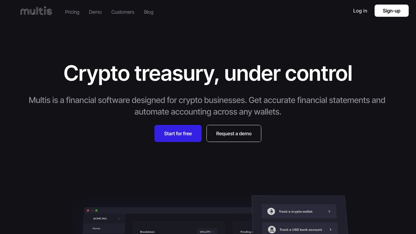 Multis is an all-in-one application for web3 organizations that offers a crypto treasury management tool that allows companies to pay in crypto and USD, automate accounting across multiple wallets, and manage their crypto treasury from a single dashboard.