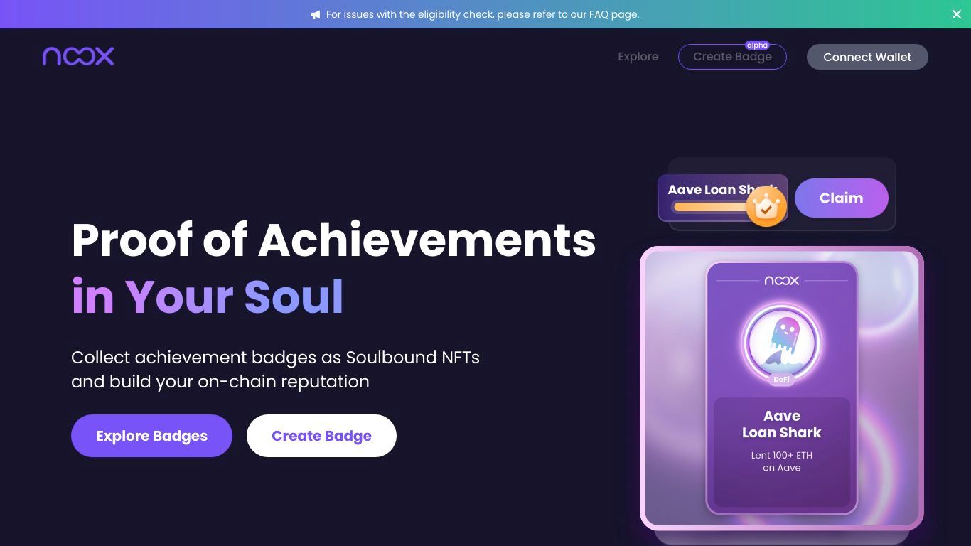 Noox is a platform that allows users to explore, collect, and share their Web3 achievements based on their historical interaction with various decentralized applications on the Ethereum network. Users can earn soul bound NFTs called "Badges" for their commitment to various protocols and share them with their community.