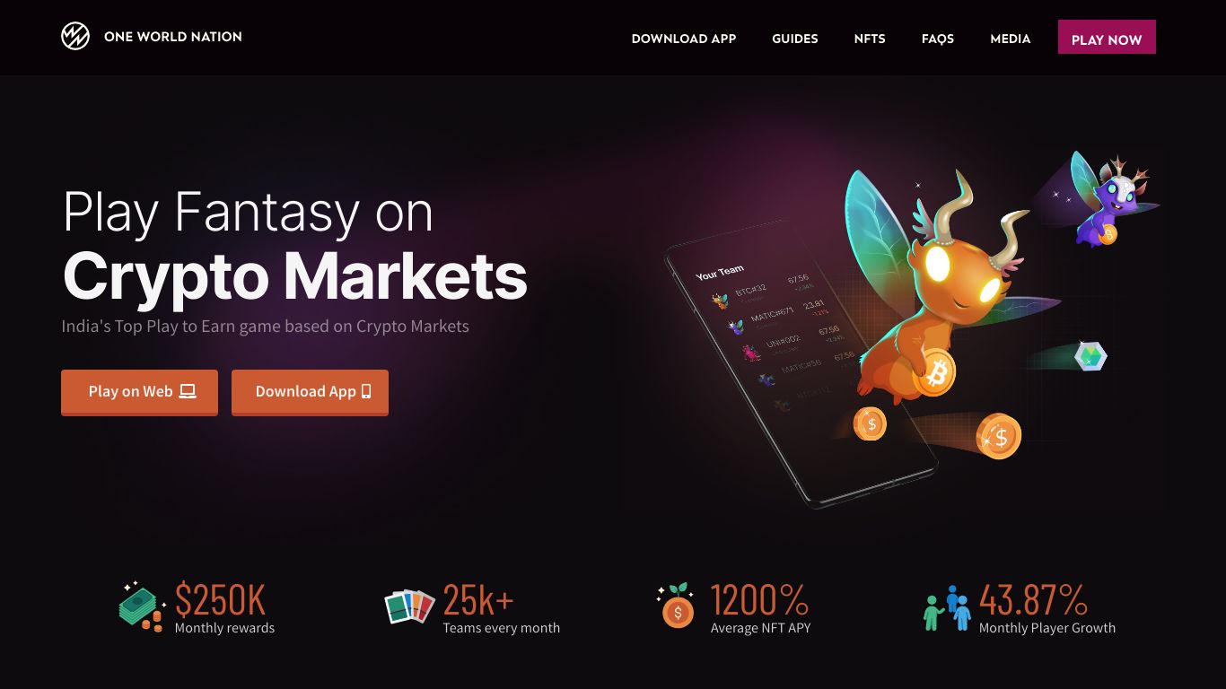 One World Nation is a global gaming platform featuring Crypto Fantasy, a fantasy crypto portfolio game that lets players earn stablecoin rewards with NFTs based on real-world crypto tokens. Also includes other games like Prediction, Raffle Rewards, and Slot Machine where players can win USDC.