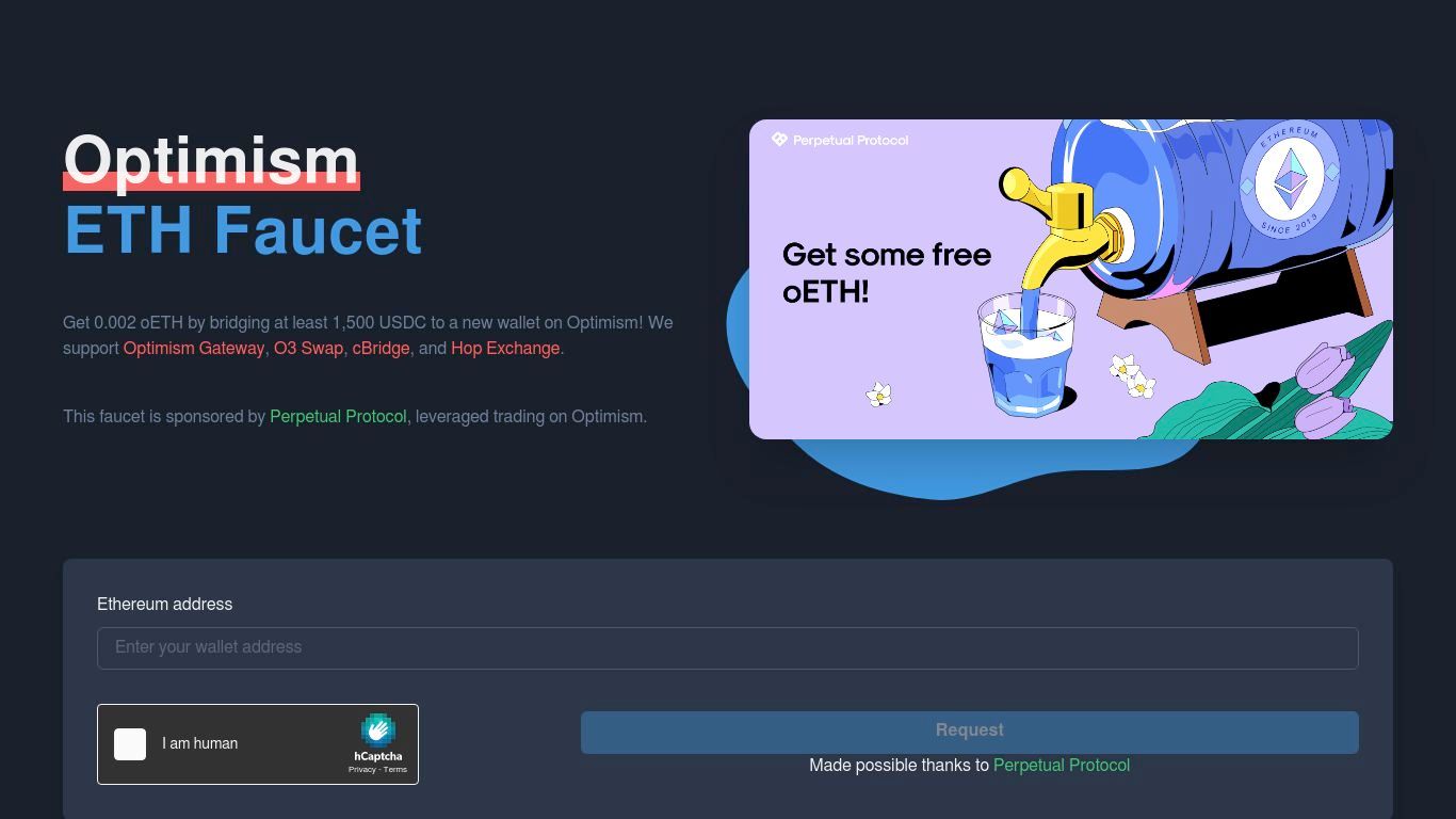The Optimism ETH Faucet is a service that provides users with a small amount of Optimism Ethereum (oETH) when they bridge at least 1,500 USDC to a new wallet on the Optimism network.