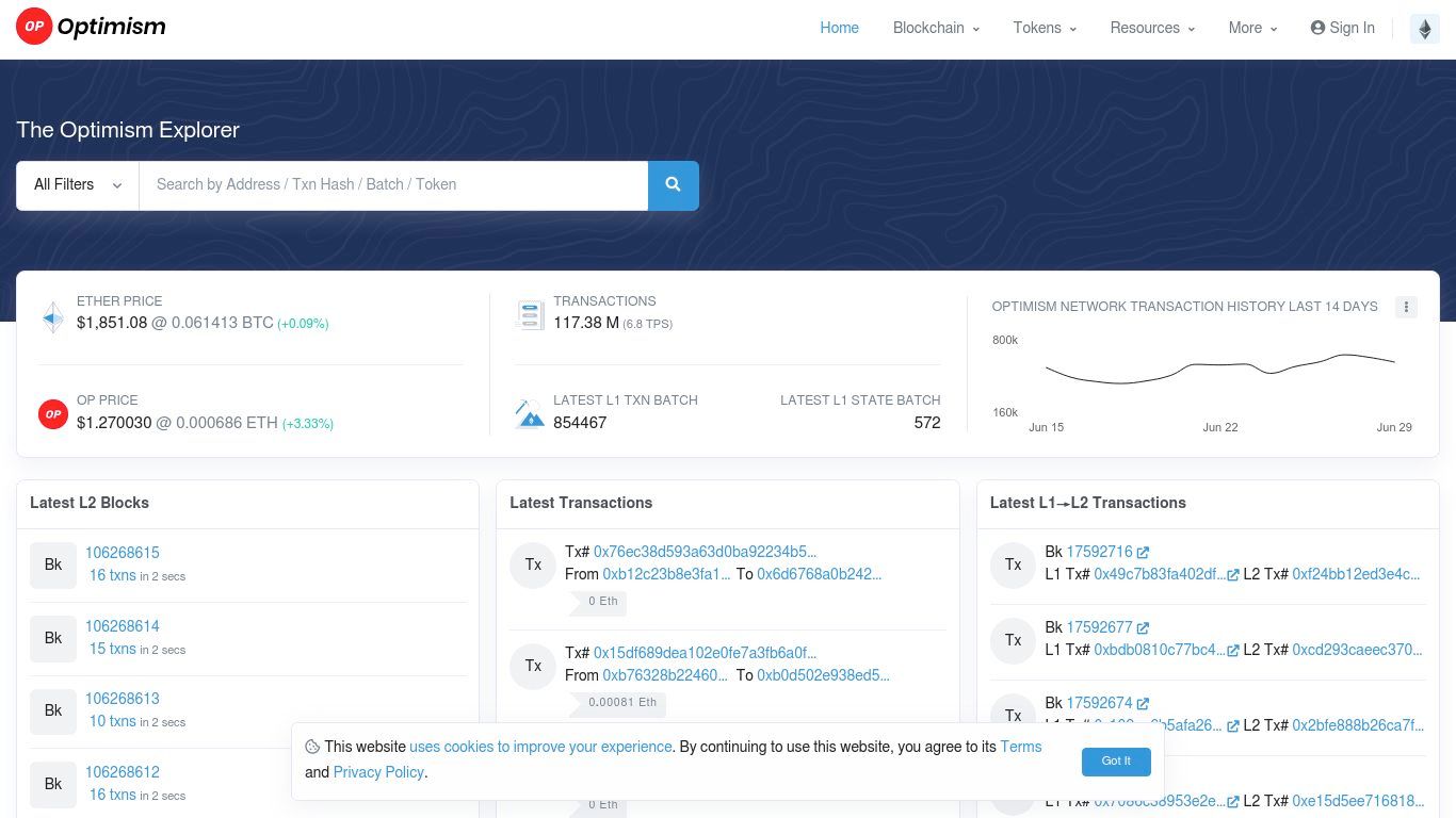 Optimistic Etherscan is a blockchain explorer and analytics platform for the Optimism blockchain allowing users to search by filtering address, txn hash, batch or token. It is specifically designed for interacting with and monitoring transactions, smart contracts, and activities on the Optimistic Ethereum network. The API can be used by developers to build dapps, verify contracts and access blockchain data such as transactions, addresses, tokens, prices and other activities.