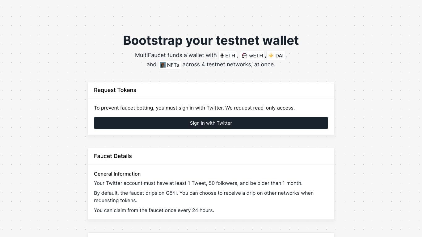 Paradigm Faucet is a comprehensive faucet that provides developers with ETH, wETH, DAI and NFTs across Goerli, Optimism Goerli, Polygon Mumbai, Arbitrum Rinkeby and Moonbase Alpha testnets. Users must connect a 1 month old Twitter account with 1 tweet and 50 followers to prevent bot usage.