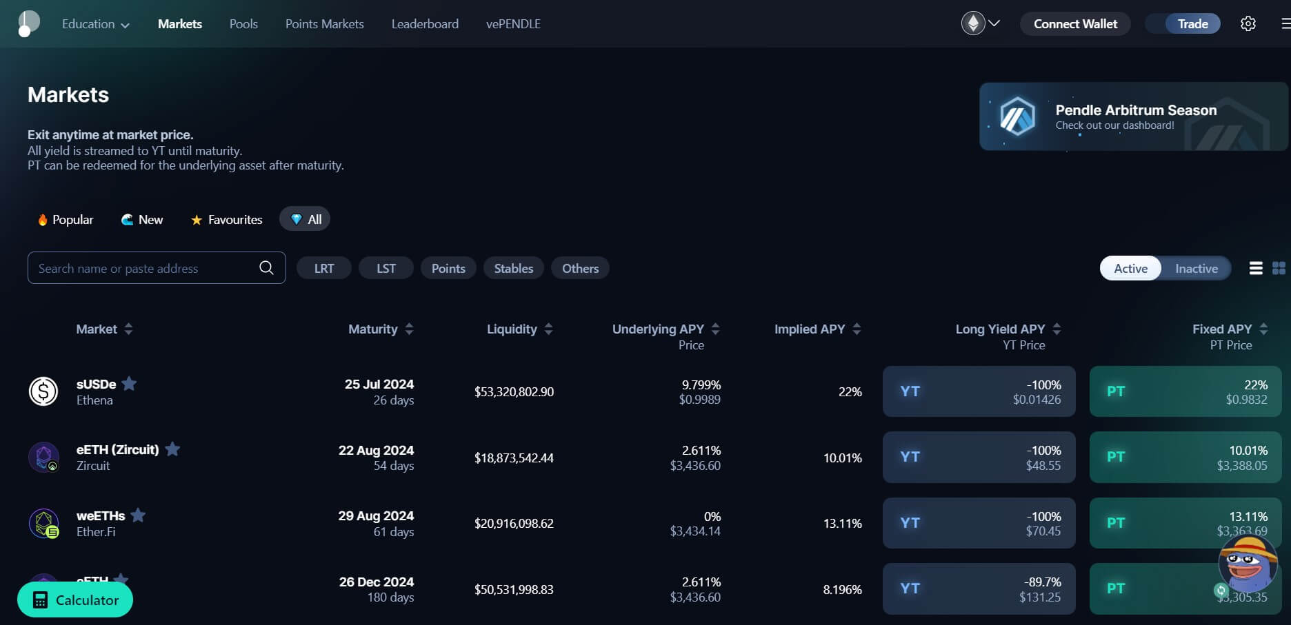 Pendle is a DeFi protocol that focuses on enabling the trading of tokenized future yield on various assets. It allows users to lock in fixed yield in advance or hedge against future yield fluctuations. Specifically designed for yield trading, this AMM features concentrated liquidity, a dual fee structure, and mechanisms to minimize impermanent loss, making it efficient for trading tokenized yields.