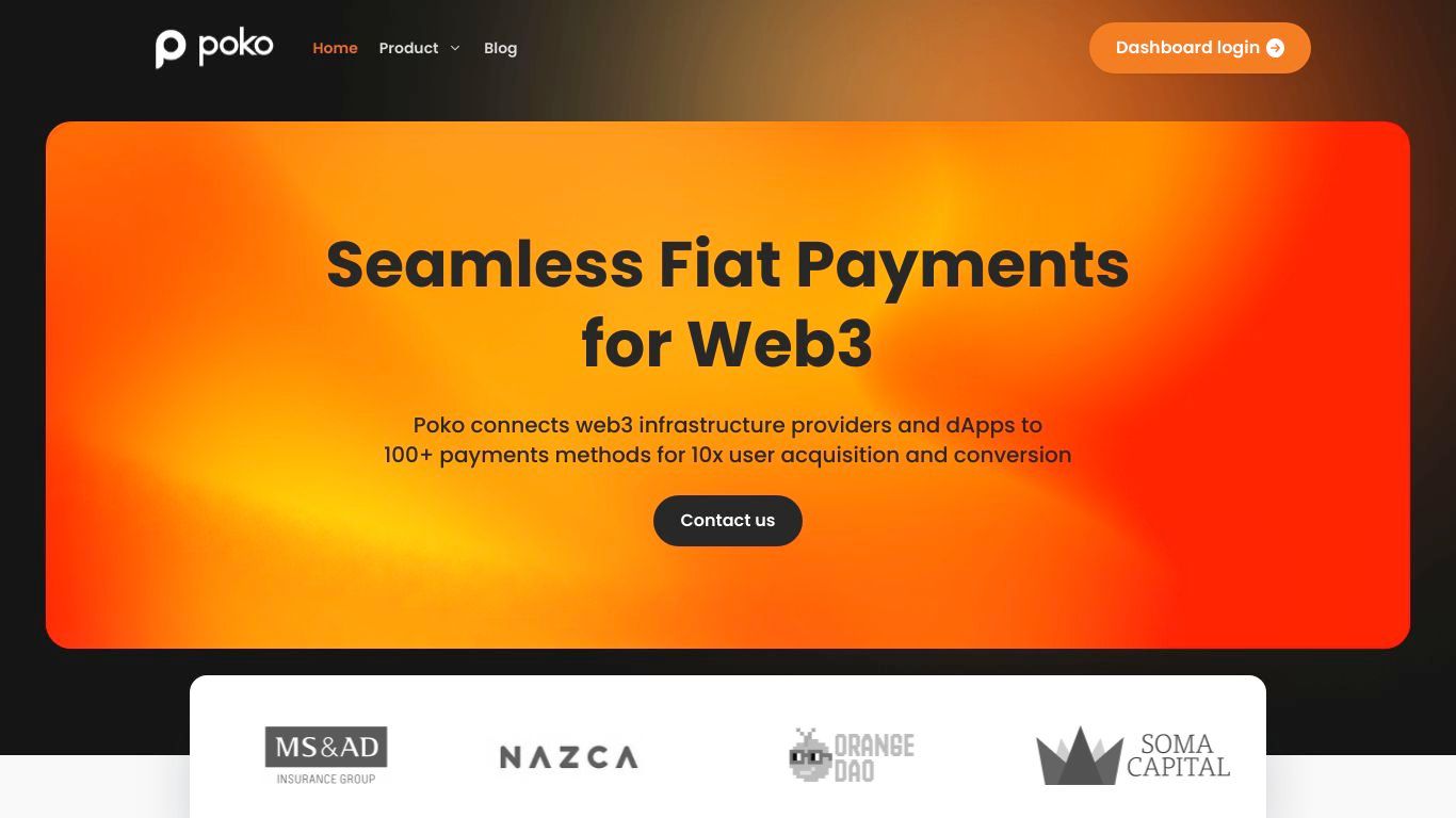 Seamless fiat payments for web3: Poko connects web3 infrastructure providers and dApps to over 100 payment methods, improving the web3 payments experience for users.
