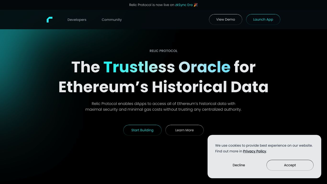 Relic Protocol is a secure and trustless solution for contracts to access historical data on-chain in a decentralized manner. It does not rely on third-party authorities by utilizing zk-SNARKs and on-chain state verification methods resulting in minimal gas usage for apps built on Relic Protocol.
