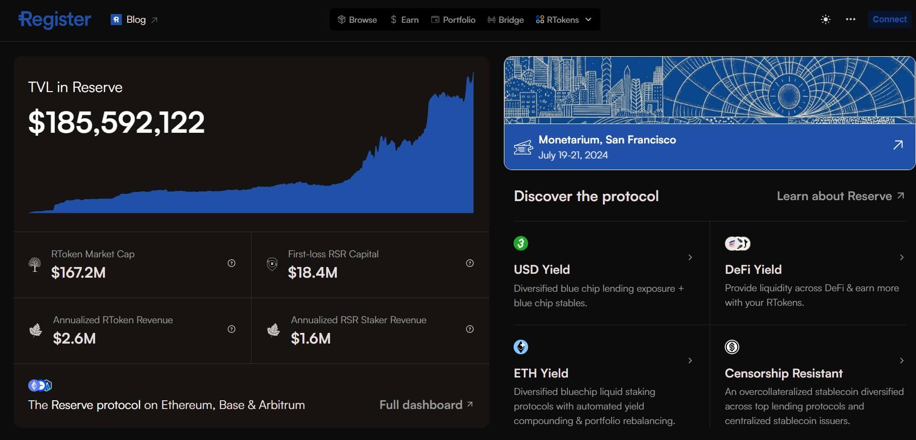Reserve is a platform that focuses on creating and managing asset-backed currencies known as RTokens. The protocol provides various functionalities including the ability to explore, research, interact with, create, and launch new RTokens. Users can also engage in staking and unstaking processes within the platform.
