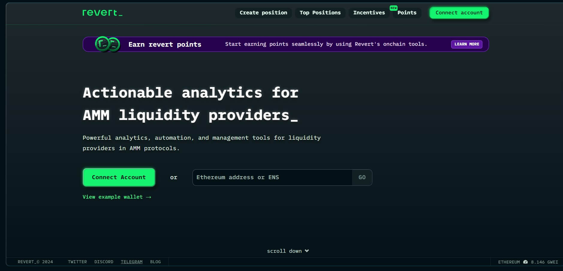 Revert is a financial analytics platform that provides tools to optimize trading strategies and manage risks by offering insights into liquidity pools, yield farming opportunities, and various DeFi protocols. The platform aims to help users make informed decisions by analyzing historical data and trends within the DeFi ecosystem.