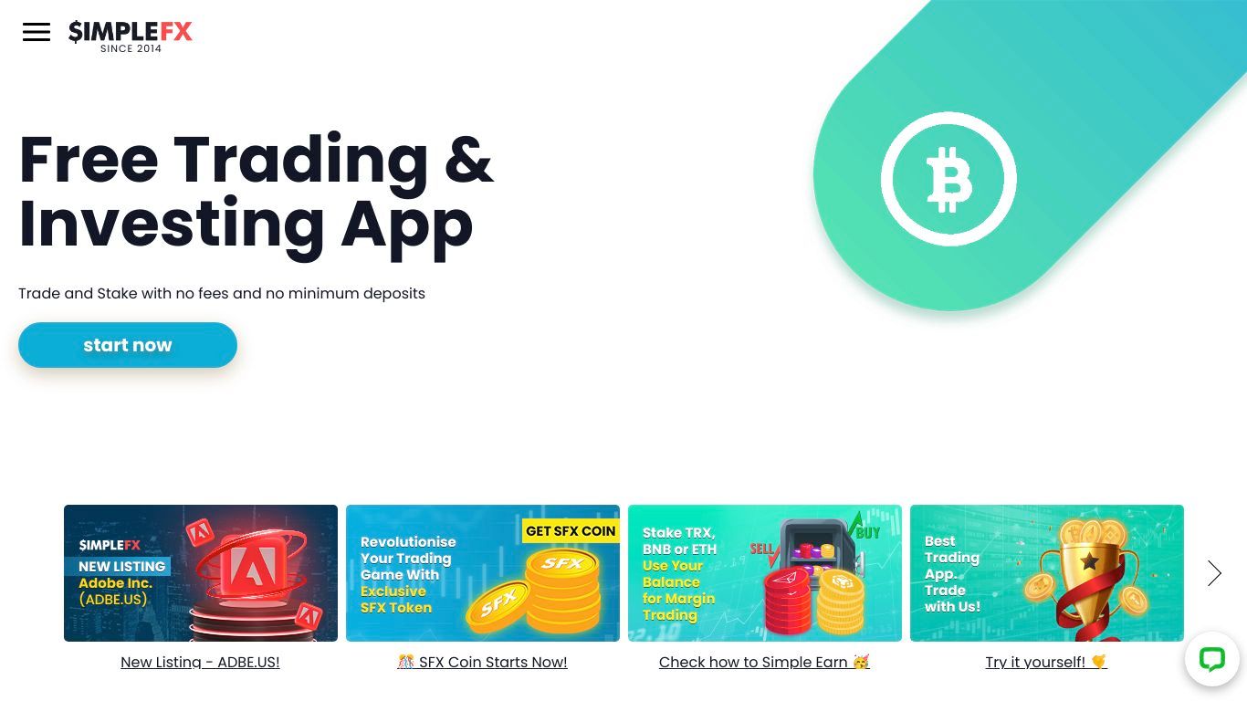 SimpleFX is a free trading and investing app with no fees or minimum deposits that allows users to trade and stake cryptocurrencies, forex, stocks, and more. Users can create an account using just an email address and easily deposit and withdraw funds with no limits.