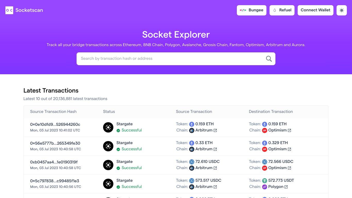 Socketscan is a tool that allows users to track bridge transactions across various blockchain networks. It provides information about the status of transactions, including transfer success, transfer time, source transaction details, destination transaction details, token sent, chain, sender address, receiver address, and timestamps.