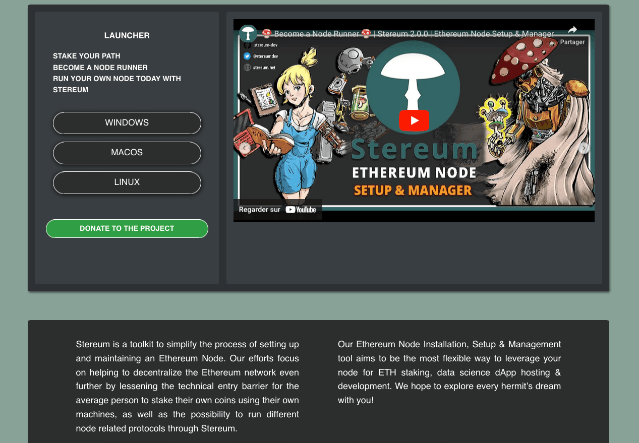 Stereum is a toolkit to simplify the process of setting up and maintaining an Ethereum Node. Their efforts focus on helping to decentralize the Ethereum network even further by lessening the technical entry barrier for the average person to stake their own coins using their own machines, as well as the possibility to run different node related protocols through Stereum.