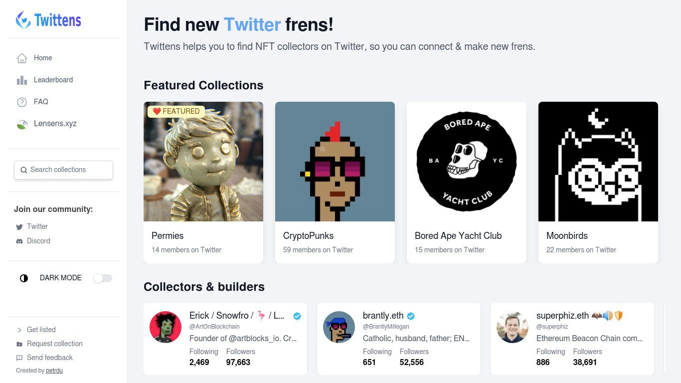 Twittens is a tool that uses ENS metadata and NFT collection owner information to generate a list of Twitter users who are members of NFT communities.