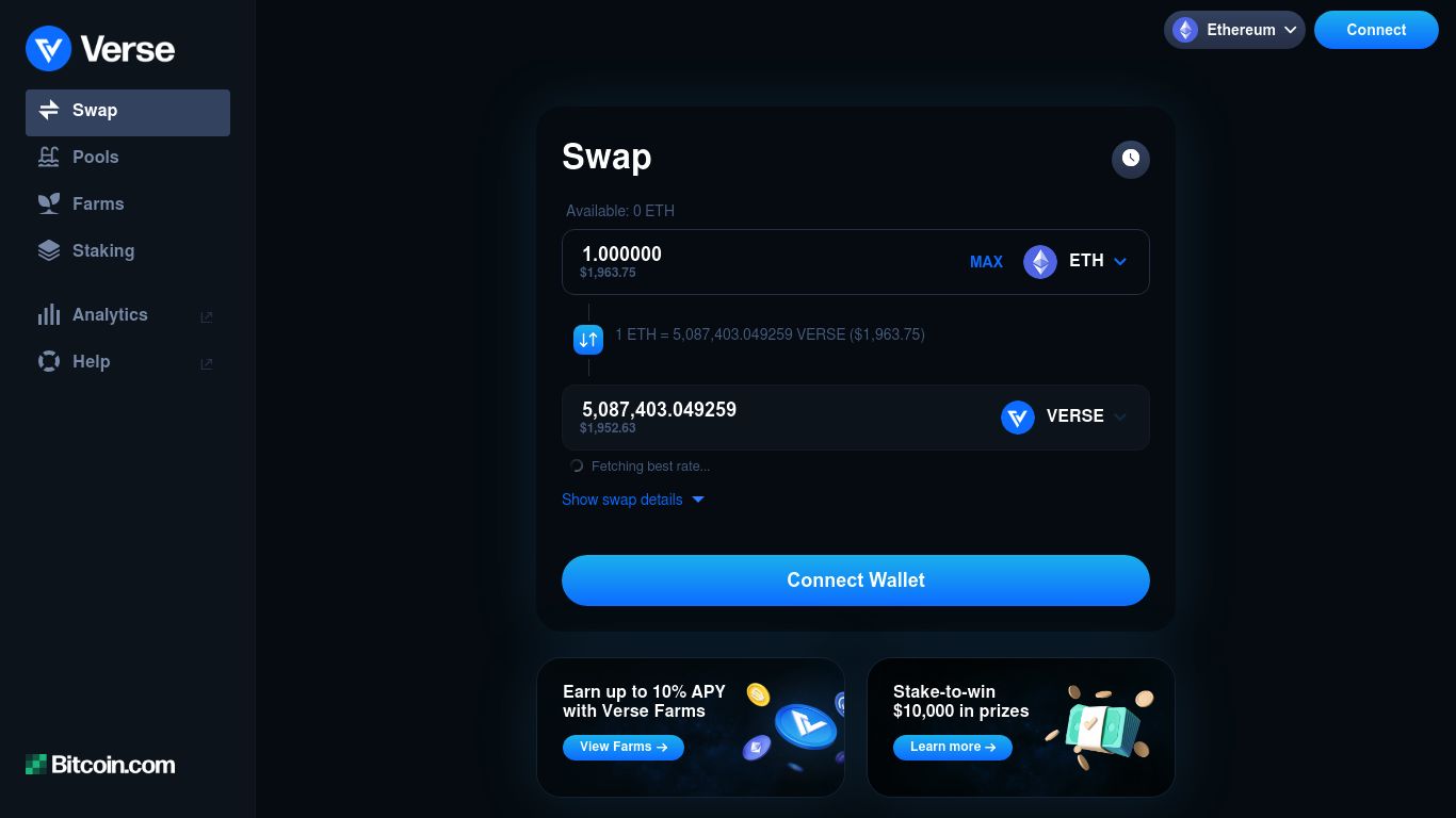 Verse is a decentralized exchange that aggregates liquidity from various sources, ensuring users can find competitive rates and fast trade execution. It focuses on providing financial self-reliance with features such as low-fee trading, liquidity pools, farming, and staking opportunities. Verse provide analytics tools integrated to help users track token performance, liquidity, and other trading metrics in real-time.