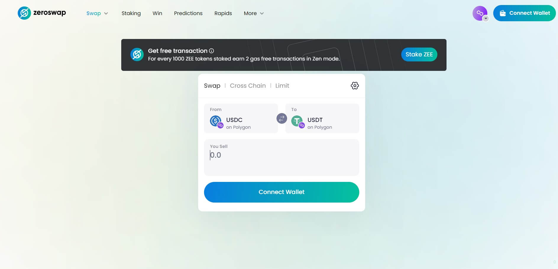 ZeroSwap is a multi-chain compatible DEX aggregator that focuses on making zero-fee transactions possible. It supports swapping of tokens from one blockchain to another. It also supports on-chain trading, liquidity farming, and staking.